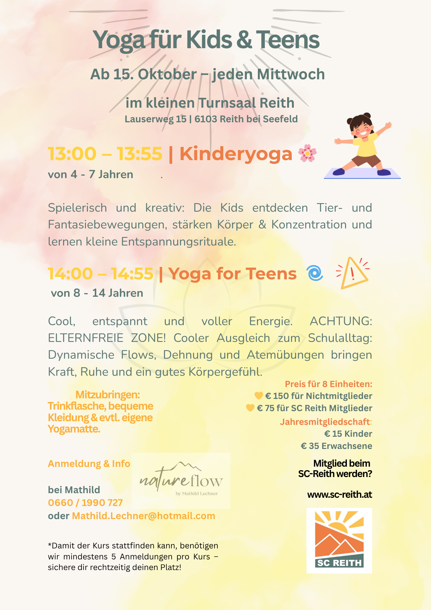 Ab 15. Oktober 2025 bietet Mathild Lechner in Zusammenarbeit mit dem SC Reith wöchentlich 2 YOGAKURSE FÜR KIDS UND TEENS im Gymnastikraum der VS Reith an.